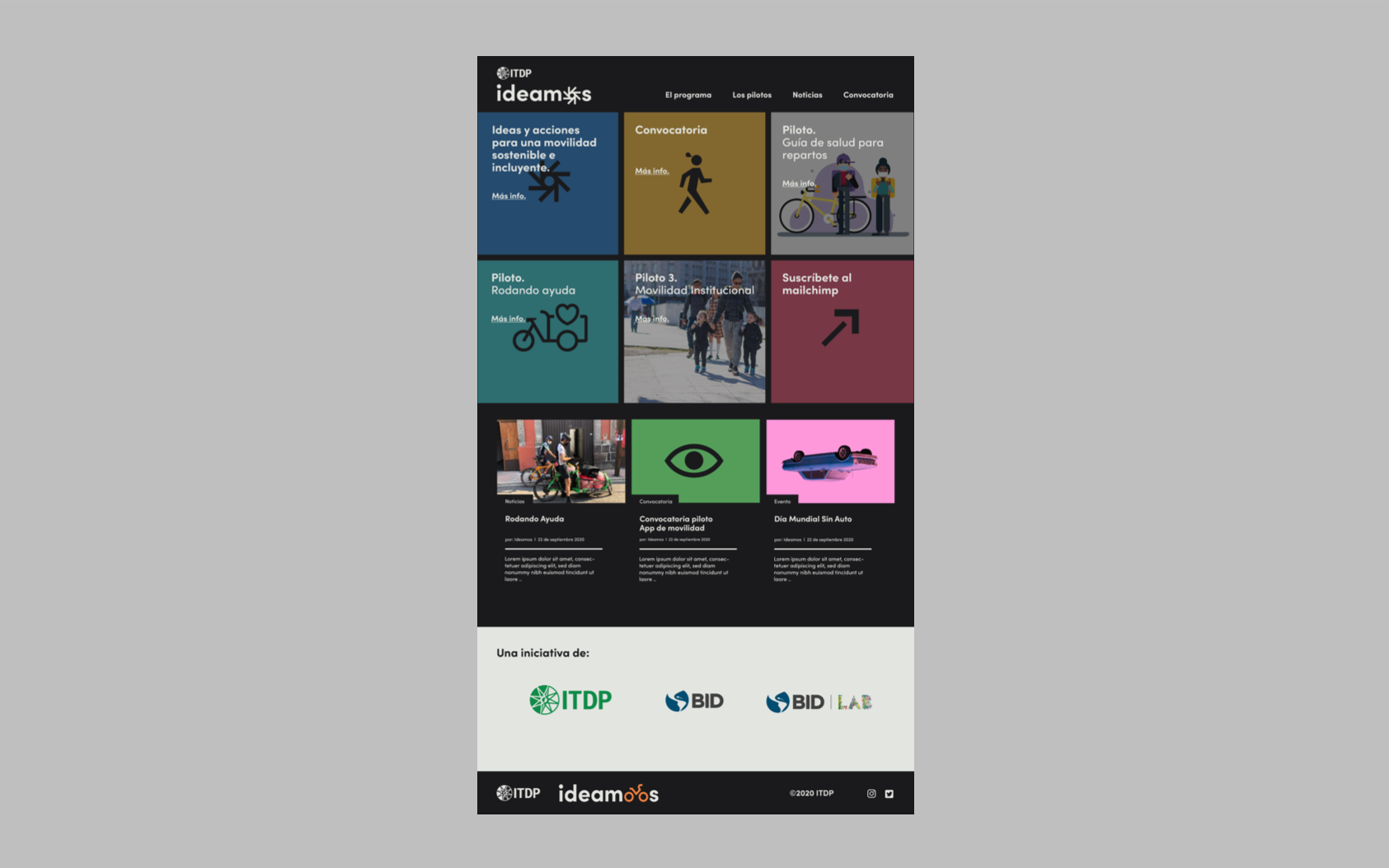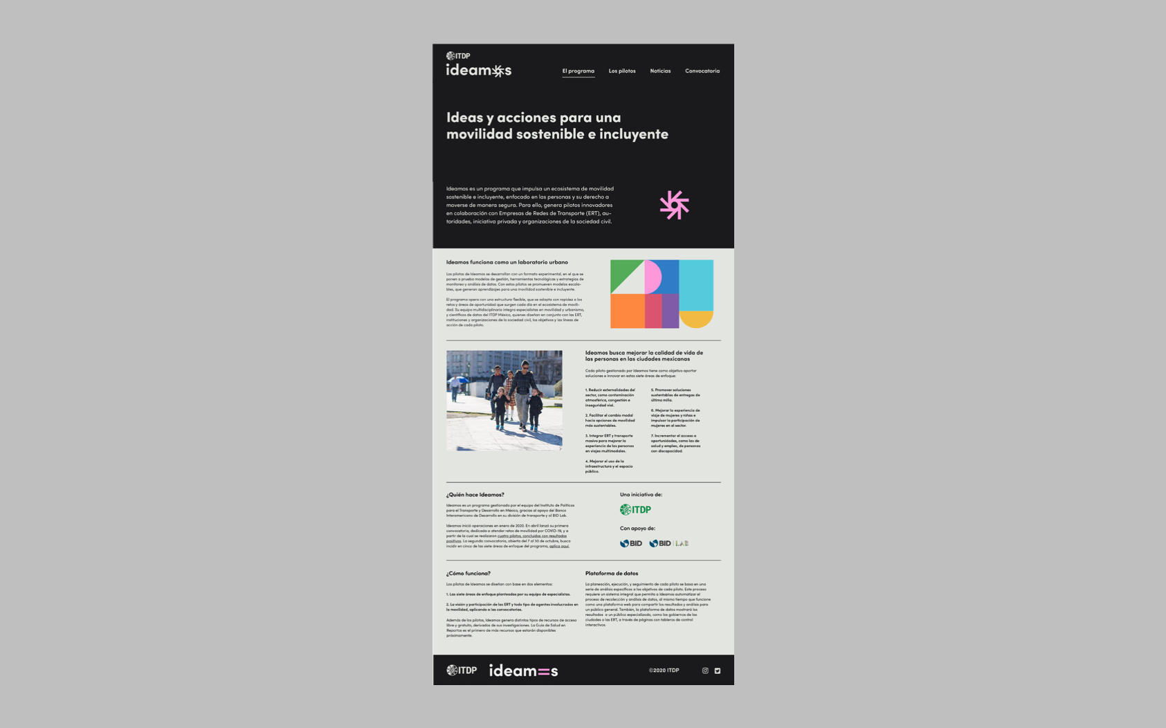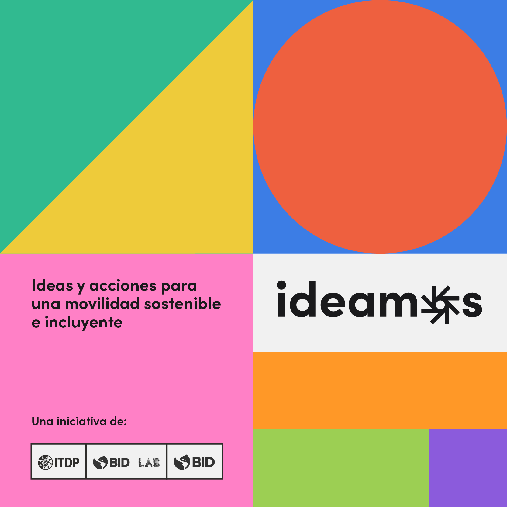 Ideamos (Ideas y acciones para una movilidad sostenible e incluyente), es una programa de ITDP Y BID que impulsa la sinergia y colaboración entre empresas de redes de transporte (ERT), instituciones y organizaciones de la sociedad civil con un objetivo en común: promover un ecosistema de movilidad en el que las personas y su derecho al transporte seguro, incluyente y responsable con el ambiente son la prioridad. Desarrollamos el concepto de marca inspirados en el movimiento.
