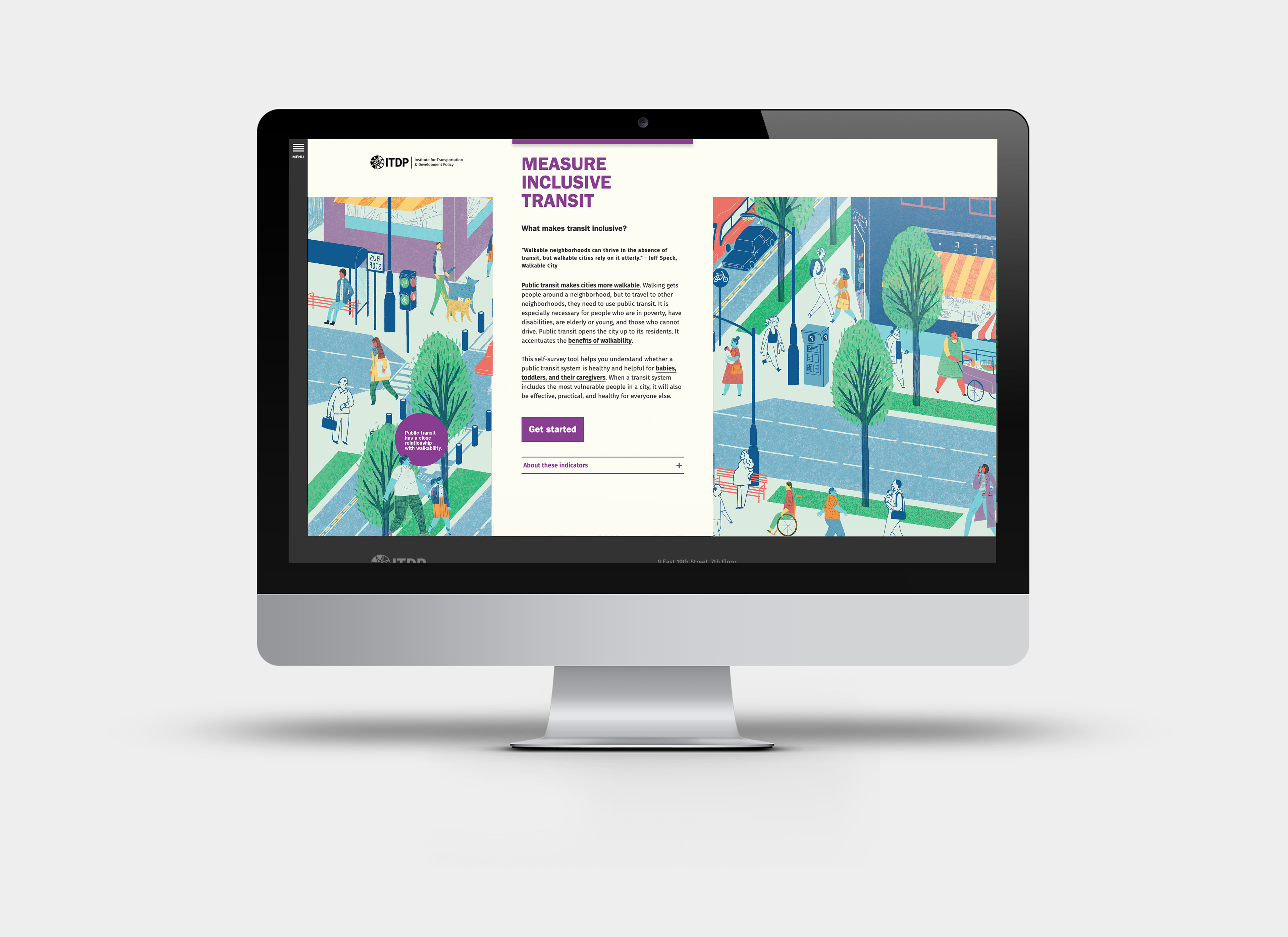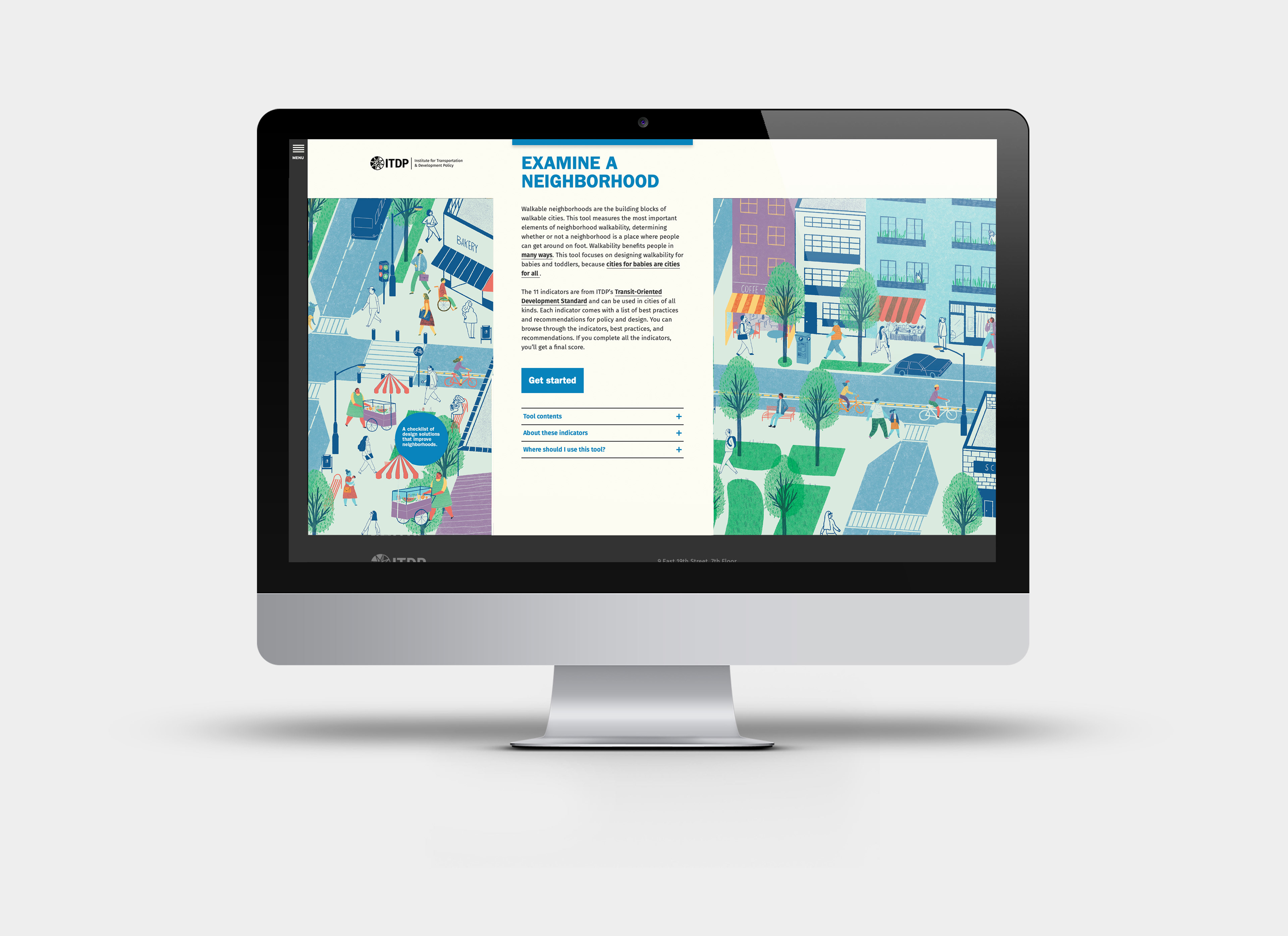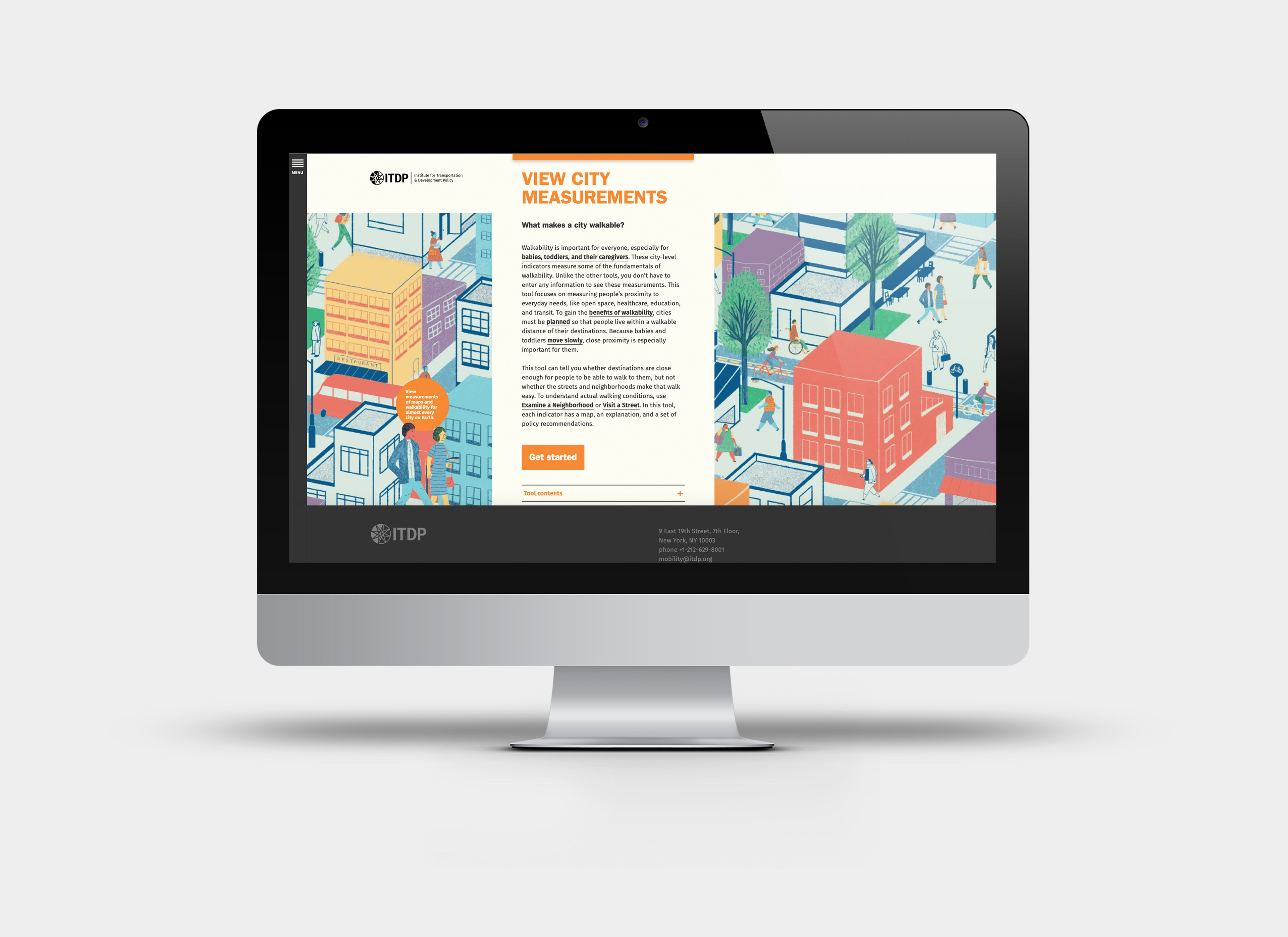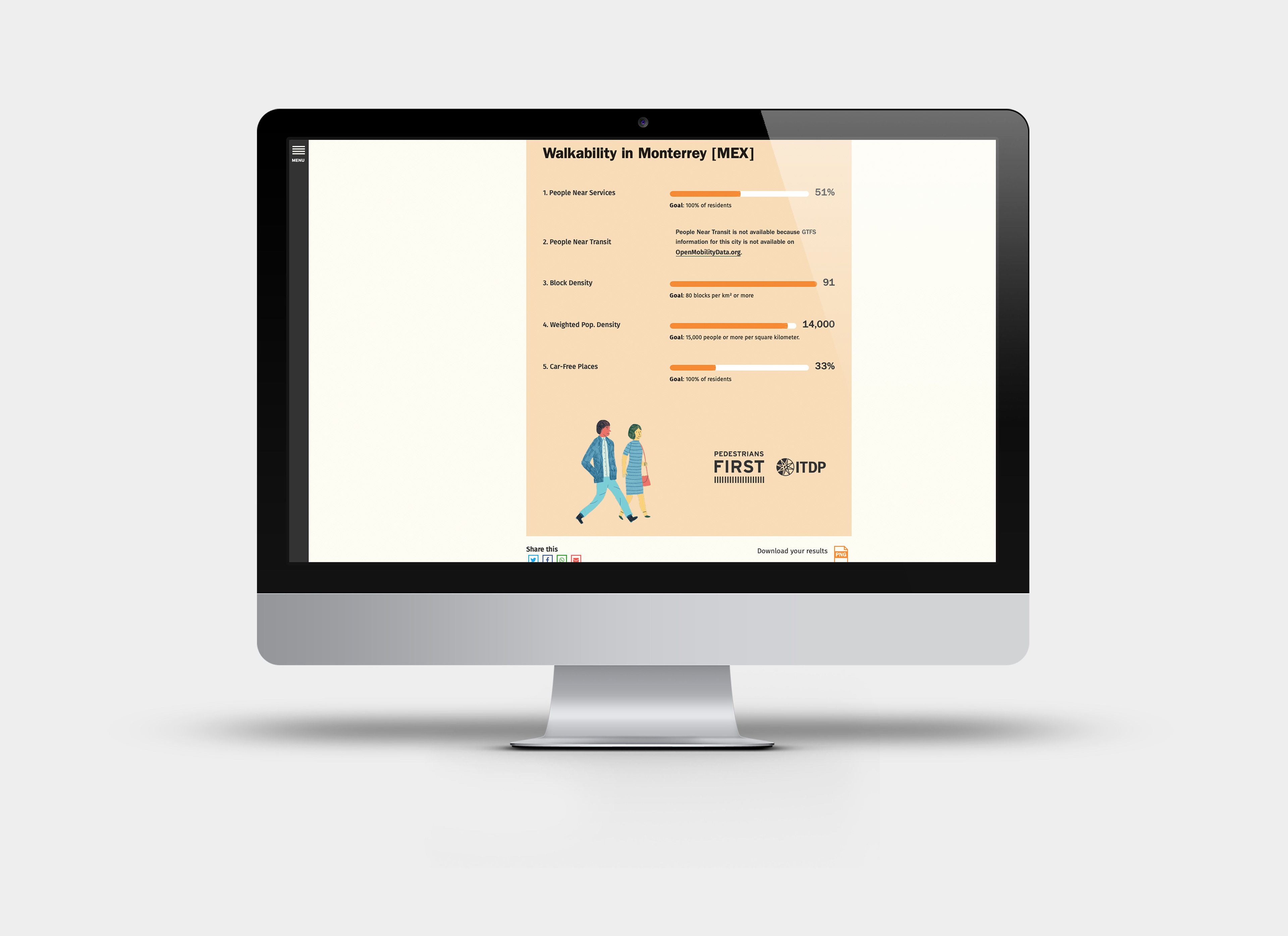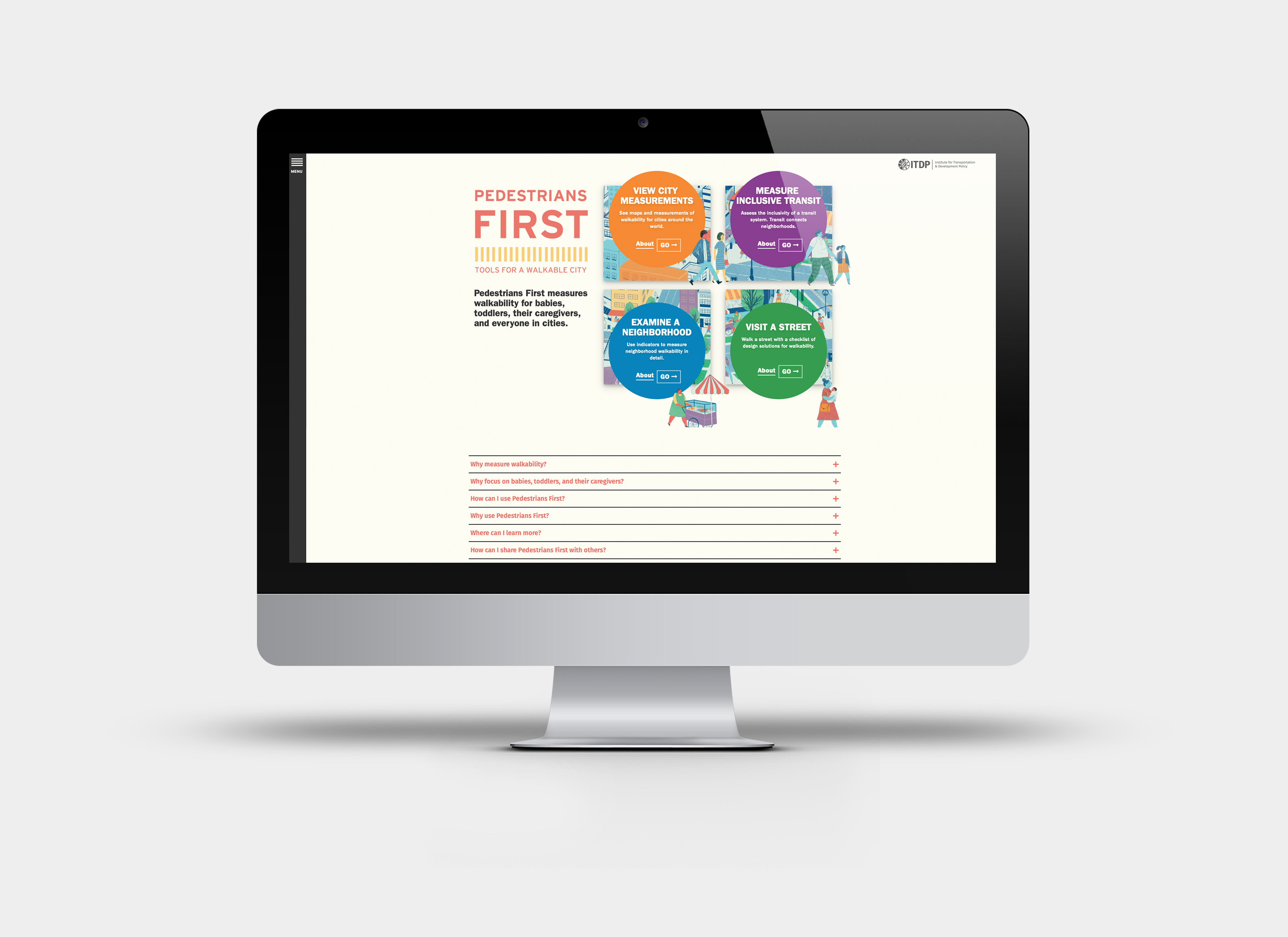 El sitio web pedestriansfirst.itdp.org es una plataforma digital con 4 herramientas para medir la caminabilidad en calles, barrios y ciudades de todo el mundo. Respetando la identidad original del proyecto se realizó un diseño web amigable y sencillo, con funcionalidades intuitivas y fáciles de usar.